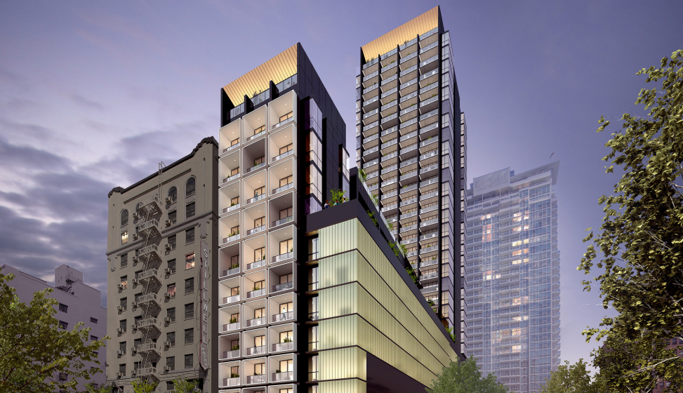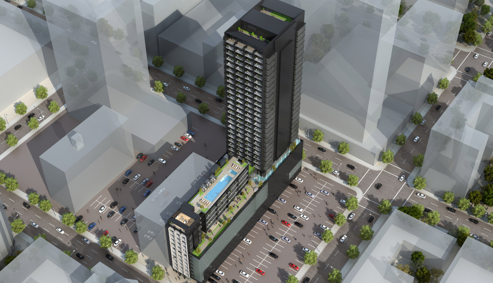 Situated on a pair of narrow mid-block lots, this 29-story mixed-use development in LA’s Financial District spans two city streets with pedestrian-friendly commercial spaces and residential lobby entrance at the ground level. Views to the above-grade parking structure are shielded on both street frontages by façade designs comprised of residential units, resident amenity spaces and translucent channel glass. Inspired by the indoor-outdoor lifestyle of Southern California, 205 residential units feature large open-air living spaces. Whether entertaining guests or enjoying a relaxing afternoon at home, residents can open a full-width sliding glass wall system to transform their unit. The result is a seamless blending of indoor and outdoor space. Residents choose from an array of landscaped terraces including a rooftop terrace on the tower’s 29th level, a spacious terrace on the 8th level including passive seating areas, a sculptural water feature and dog run, and a pool and spa deck with private cabanas on the 12th level.