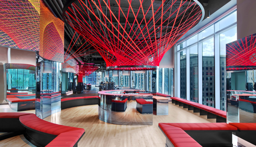 Our design integrates elements of everyday fitness equipment and components into the interior architecture. Three colors of TRX fitness straps, brightly lit, are arranged into a series of grand ceiling sculptures, starting over the front desk and ending at the entry to the locker rooms. The series is visually connected via a 2D graphic painted on the raw concrete core wall. A two-way mirror at the entry provides a reflective surface for the group fitness area while allowing views to the inside by people in adjacent areas, creating a theatrical, high-energy entrance. Finishes and furnishings take their cue from high-performance fitness fabrics and sneaker materials.