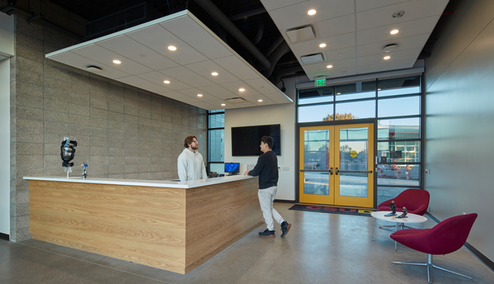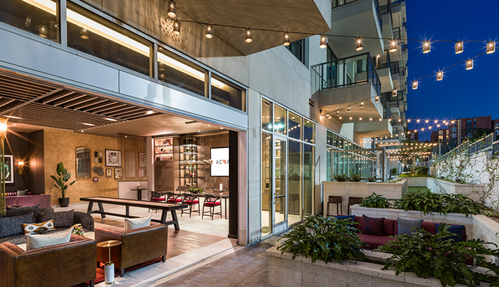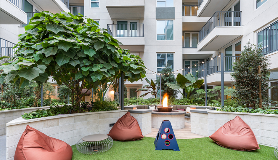 Amenities are organized across three levels to support daily living and resident interaction. The ground-floor leasing area includes an interior stair that leads directly to the second-floor amenity level, which opens to a central courtyard and includes a two-story fitness center. Additional shared spaces are located on the eighth floor, including an amenity lounge and rooftop terrace with landscaped areas, lounge seating, fire pits, barbecues, co-working space, and views of downtown San Diego and the bay. By combining high-performance sustainability, efficient parking solutions, and well-planned amenities, The Monroe delivers practical, comfortable urban housing that supports both residents and the surrounding neighborhood.