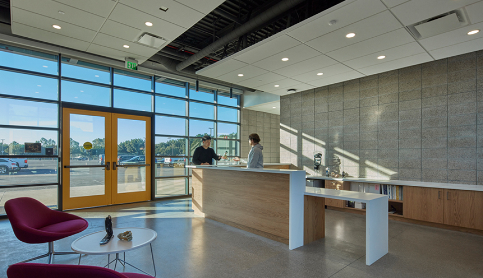 The building is designed as a 5-over-3 podium structure that fits comfortably within a neighborhood of primarily lower-scale buildings while introducing a contemporary residential presence. Two simple but connected design elements meet at the corner, where a fully glazed amenity space is framed by projecting concrete that forms a continuous balcony and creates an active street edge. Material contrasts help define the building’s character. The south façade features smooth white plaster that reflects daylight and keeps the massing light, while the east façade uses textured fiber-cement panels and a regular pattern of openings and balconies to add depth and rhythm. Together, these elements create a clear, cohesive identity that complements the surrounding context.